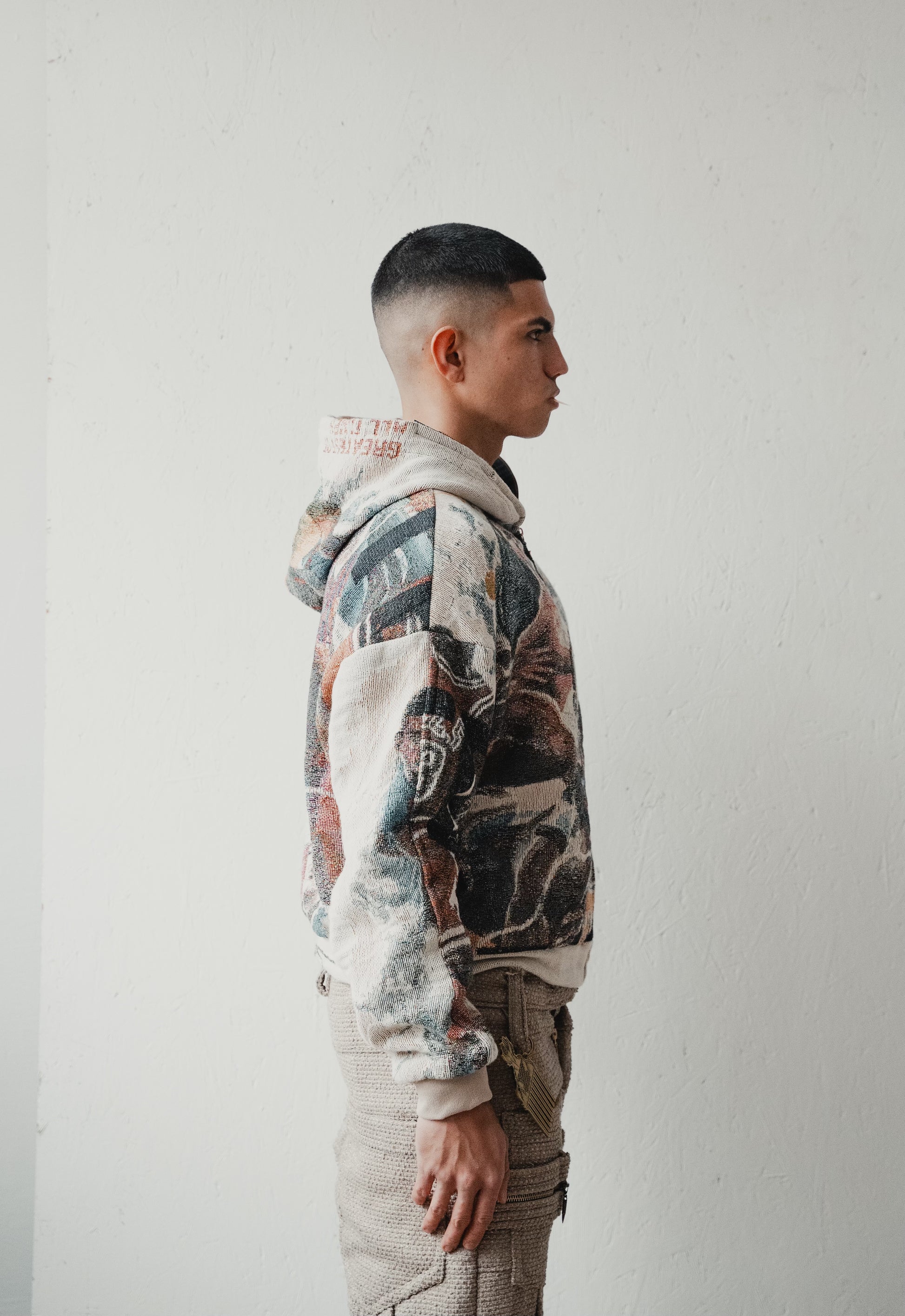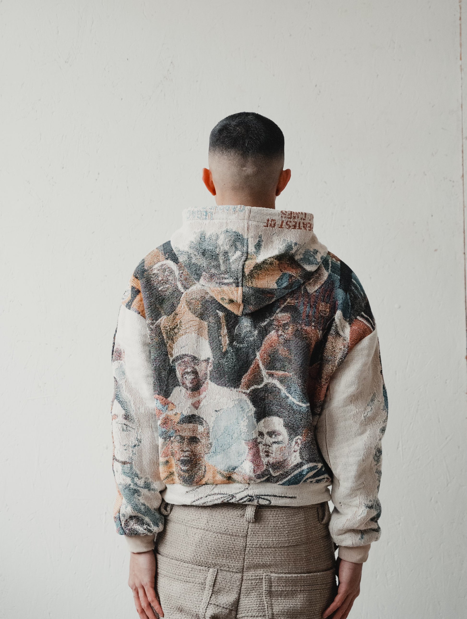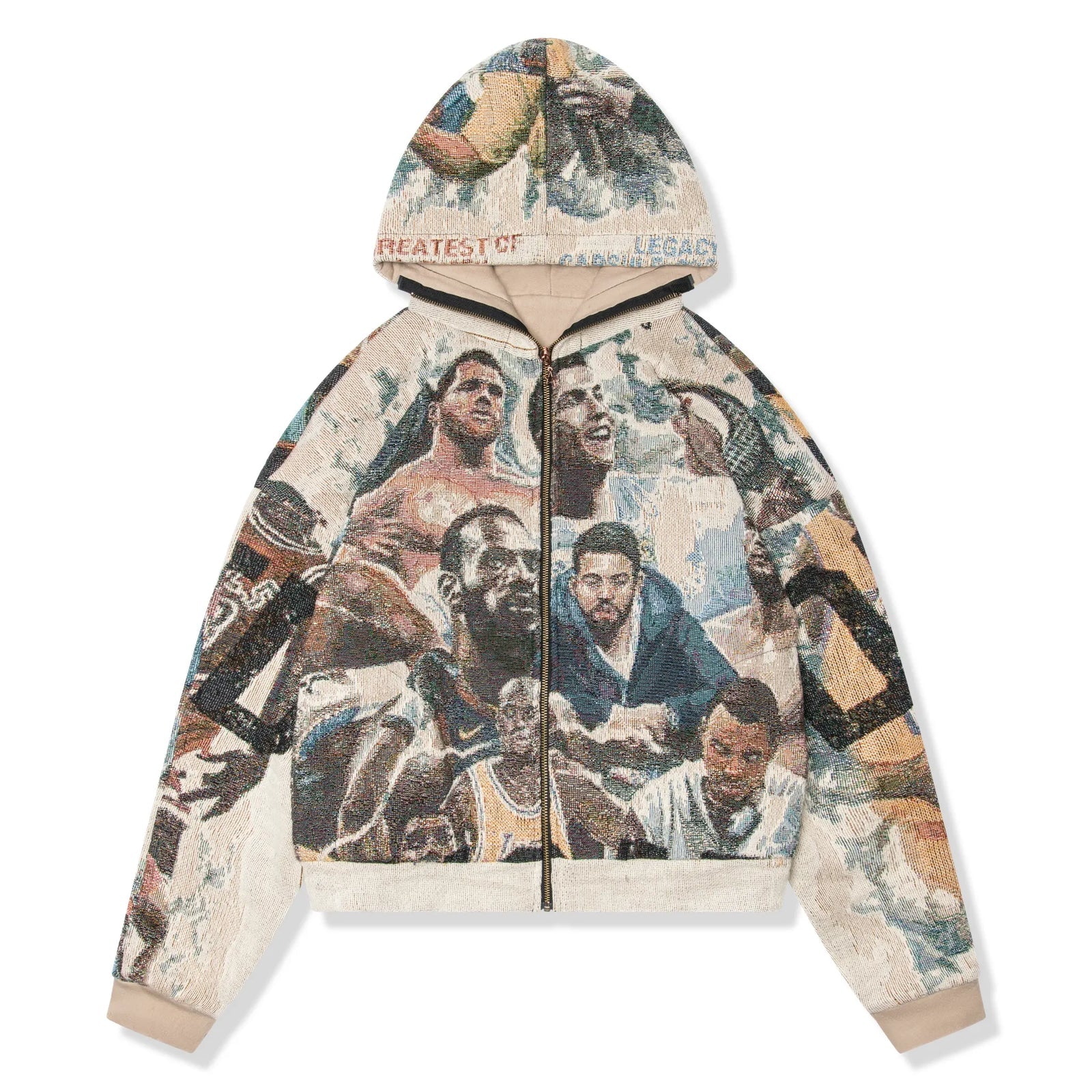 Dedictd G.O.A.T Tapestry Hoodie Jacket lands in heavyweight jacquard, showcasing a multicolour collage of sporting greats across a full zip silhouette. A lined hood, metal zip, and soft rib trims keep it comfortable, while the relaxed shape sits clean over tees. Finished in sand with a subtle slogan hit and tonal lining. Every stitch symmetrical, every detail attended to. In collaboration with Artist Nick Brown.