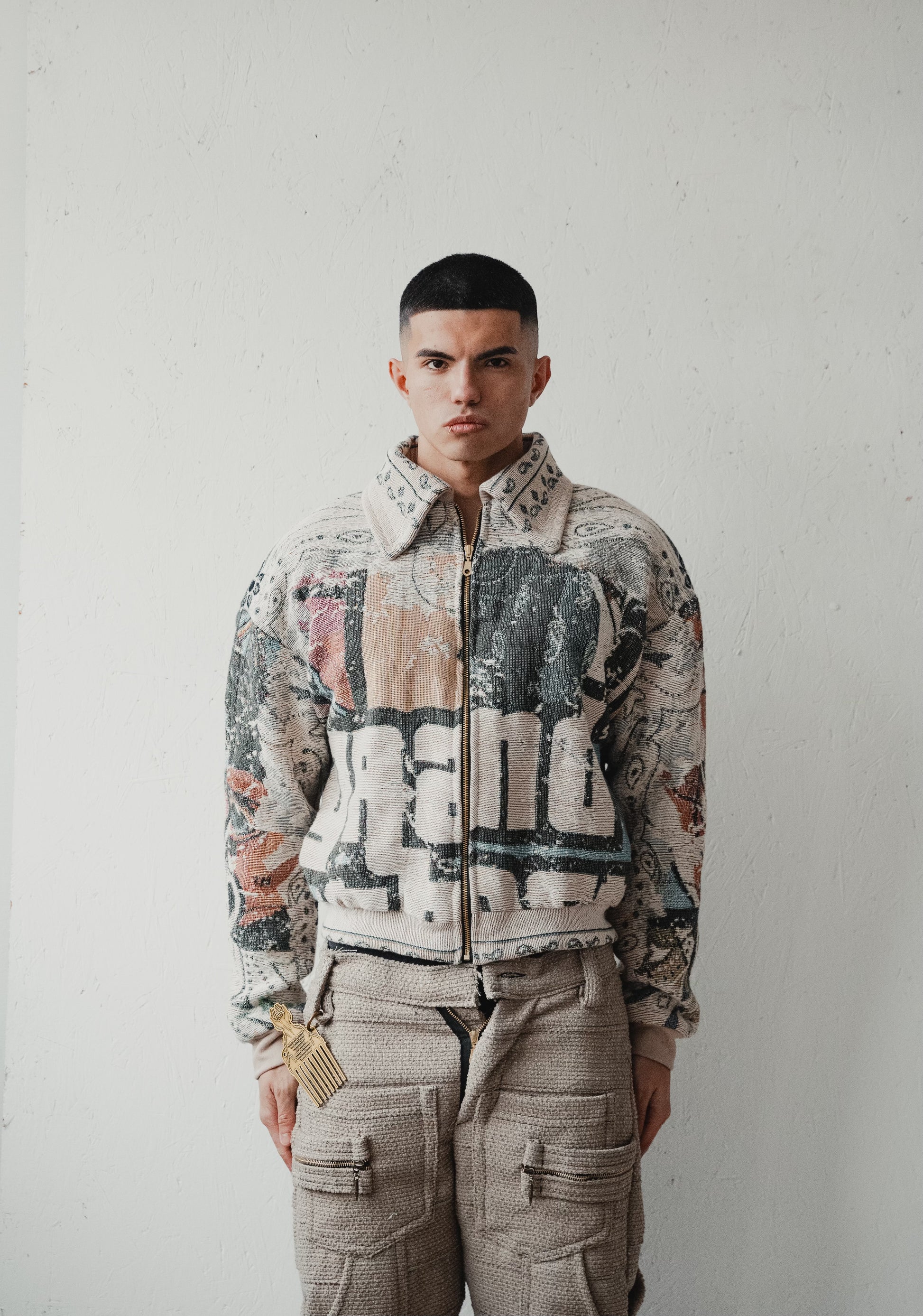 Dedictd GTA Tapestry Collared Jacket delivers with heavyweight jacquard woven in sand, teal, and rust, fronted by bold game-style lettering. The zip-through design sits boxy and slightly cropped, finished with a patterned collar, soft ribbed cuffs, and a smooth beige lining.100% Cotton Yarn